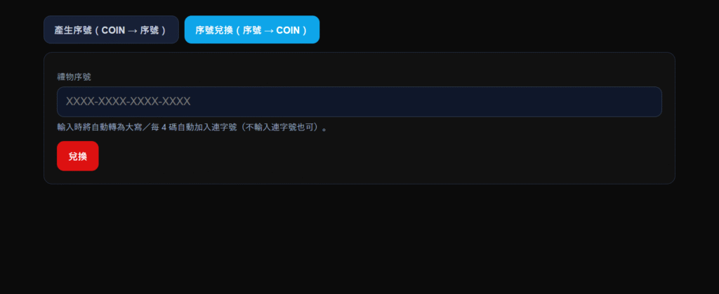 接著選擇「產生序號(COIN→序號)」,輸入想要轉換為序號的代幣數量以及序號的有效期限。